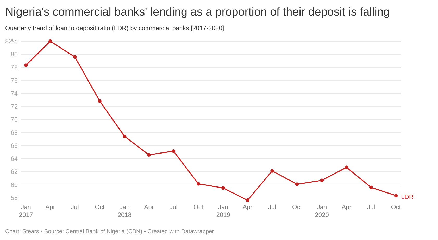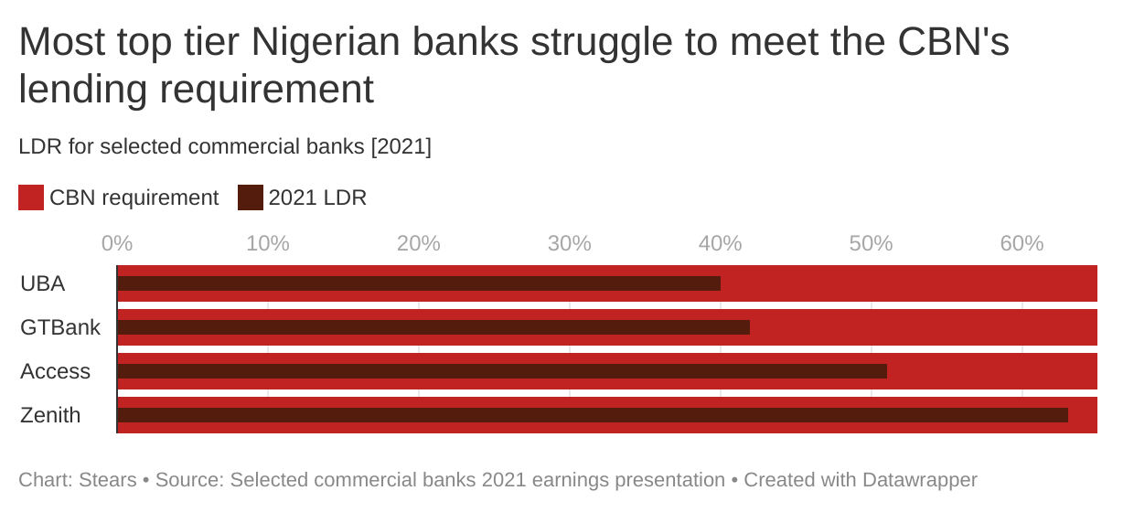 As of Q4’2020 LDR for Nigerian commercial banks was 58%. This is low compared to other countries that give out as much as 70% and 90% of their deposits.