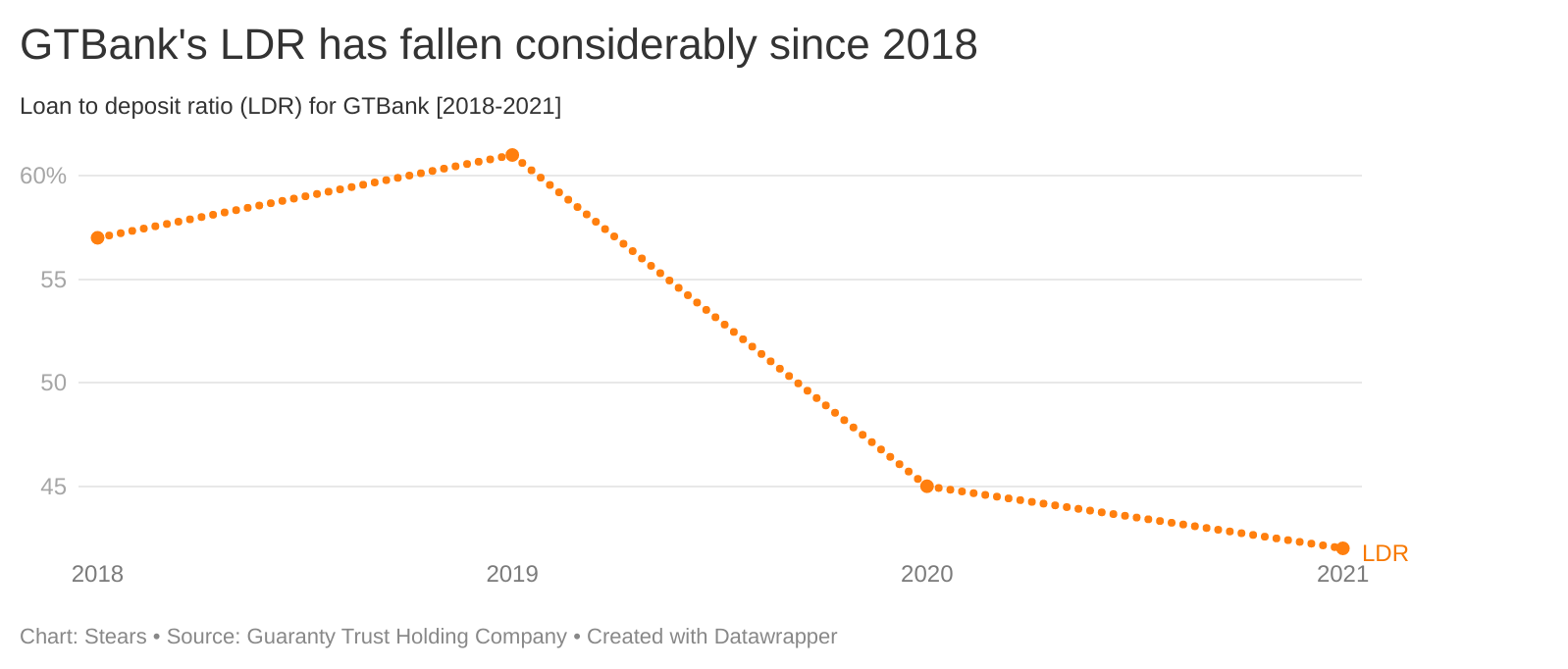 A bank that lends all of its deposits will have an LDR of 100%. However, recent financial reports of Nigeria’s biggest commercial banks show that some banks are not lending up to half of their total deposits. For instance, last year, GTBank, the commercial banking arm of GTCO, gave out only 42% of its deposits as loans, down from 45% and 61% of its deposits given out as loans in 2020 and 2019 respectively. In its most recent investor presentation, the bank outlined that it would give out only half of its deposits as loans in 2022.